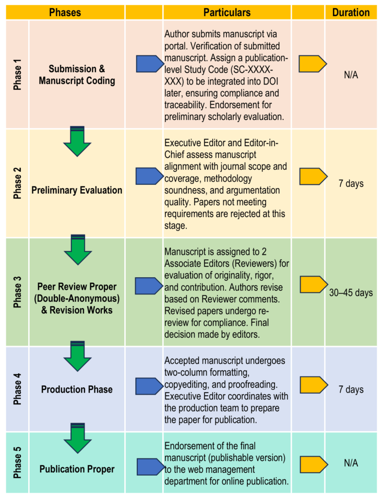 For manuscripts that pass the initial screening, the process moves into double-anonymous peer review proper, which spans approximately 30 to 45 days from submission to acceptance. At this stage, the Executive Editor, in coordination with the Editor-in-Chief, assign the manuscript to 2 qualified Reviewers (Associate Editors) who critically evaluate its originality, methodological rigor, and contribution to the field. Reviewers provide detailed comments and constructive suggestions, which are then communicated to the authors. Authors are expected to revise their manuscripts in response to these comments, applying the necessary rigor to strengthen their work. Revised manuscripts will undergo re-review to ensure that the revisions adequately address the reviewers’ concerns. The executive editor, in consultation with the editor-in-chief, makes the final decision to accept or reject the manuscript based on the reviewers’ recommendations and the quality of the revisions.
